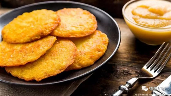Kartoffelpuffer - 油煎薯饼 这道菜再次证明德国人具有让土头土脸的马铃薯“脱胎换骨”的本领。将马铃薯刨成细丝,加少量面粉和鸡蛋以及调料,在平锅中摊成饼煎,两面金黄。传统的吃法是配苹果泥,也有地方习惯和烟熏三文鱼一起吃,别有风味。
