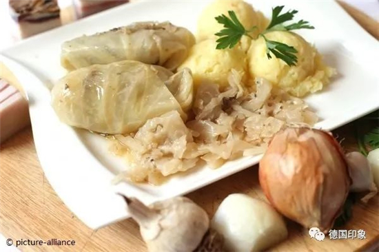 Kohlrouladen - 卷心菜肉卷 这是一道典型的冬季菜肴。整张卷心菜叶蒸熟后,包入肉馅,放到汤汁或西紅柿汁里炜煮,好处是十分入味。