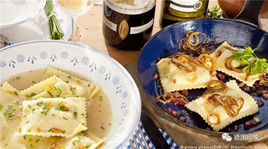Maultaschen - 德式饺子 又是施瓦本的特色美食!有人说它是大号的意大利饺子(Raviolis),但德式饺子的馅料无疑更符合中国人的口味:猪肉、鸡蛋、菠菜、奶酪等。传说这种饺子是由毛尔布隆(Maulbronn)男修道院的修士发明的,是为了方便在四旬斋(复活节前的四十天)期间偷吃猪肉而设计的。