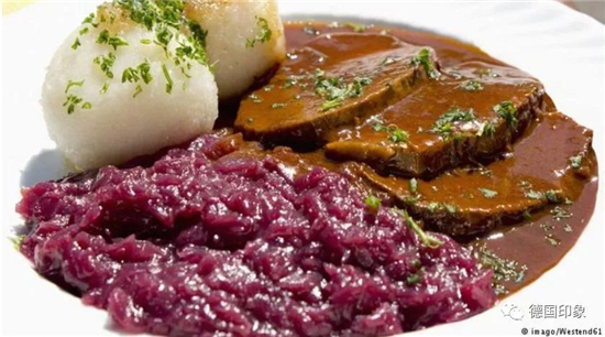 Sauerbraten - 醋焖牛肉 这道菜大多选用牛肉,但也可以用其他肉类。烹制前要先将肉在红酒、醋和其他调料配成的酱汁里浸泡10天,这样才能让肉质酥嫩入味儿。吃的时候一般配苹果汁炖紫甘蓝。