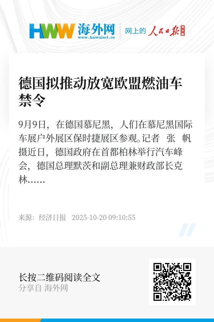 德国提议的未来走向取决于下一步欧盟内部的讨论。在多次汽车业高层会议后,欧盟委员会主席冯德莱恩正考虑是否修改两年前通过的2035年“燃油车禁令”。欧洲向电动汽车转型的速度过慢,汽车行业正在推动这一进程。与此同时,德国汽车制造商和零部件供应商面临来自外部的激烈竞争和美国提高进口关税的双重压力而深陷危机。峰会期间,默茨已表示,他将在下一次欧盟峰会上提出放宽欧盟2035年“燃油车禁令”的议题。克林拜尔补充称,联合政府将在欧洲“发出一致的声音”。(经济日报 作者:陈希蒙)