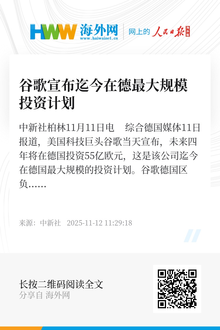 中新社柏林11月11日电 综合德国媒体11日报道,美国科技巨头谷歌当天宣布,未来四年将在德国投资55亿欧元,这是该公司迄今在德国最大规模的投资计划。