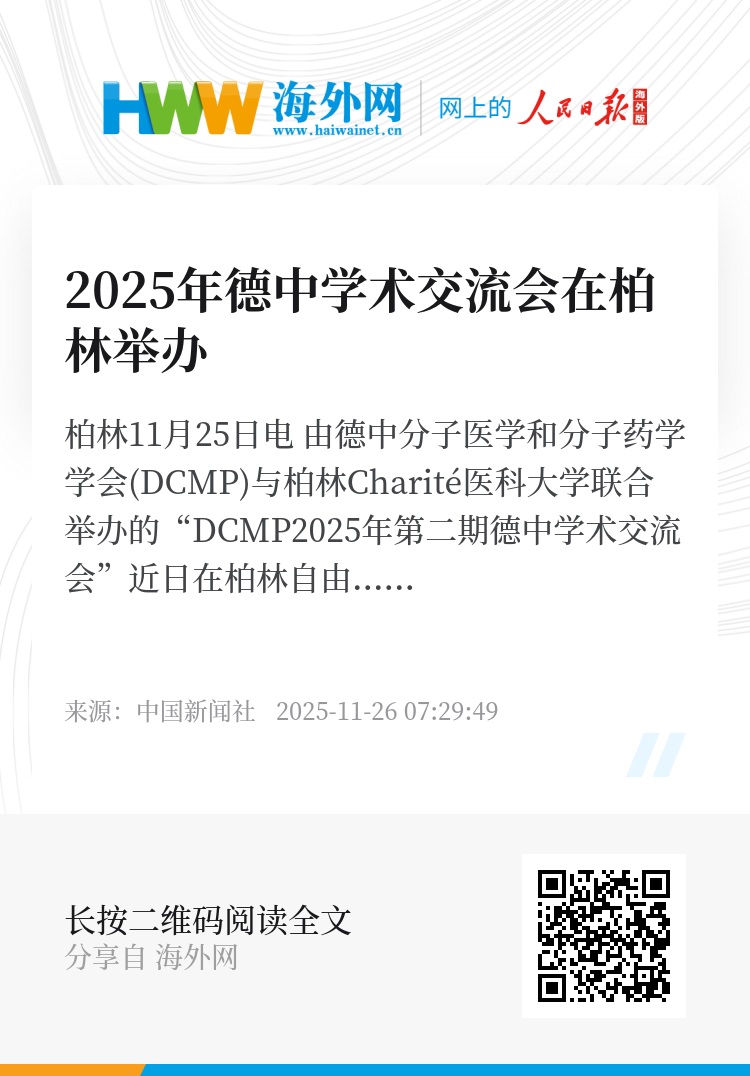 中新网柏林11月25日电 由德中分子医学和分子药学学会(DCMP)与柏林Charité医科大学联合举办的“DCMP2025年第二期德中学术交流会”近日在柏林自由大学举行。