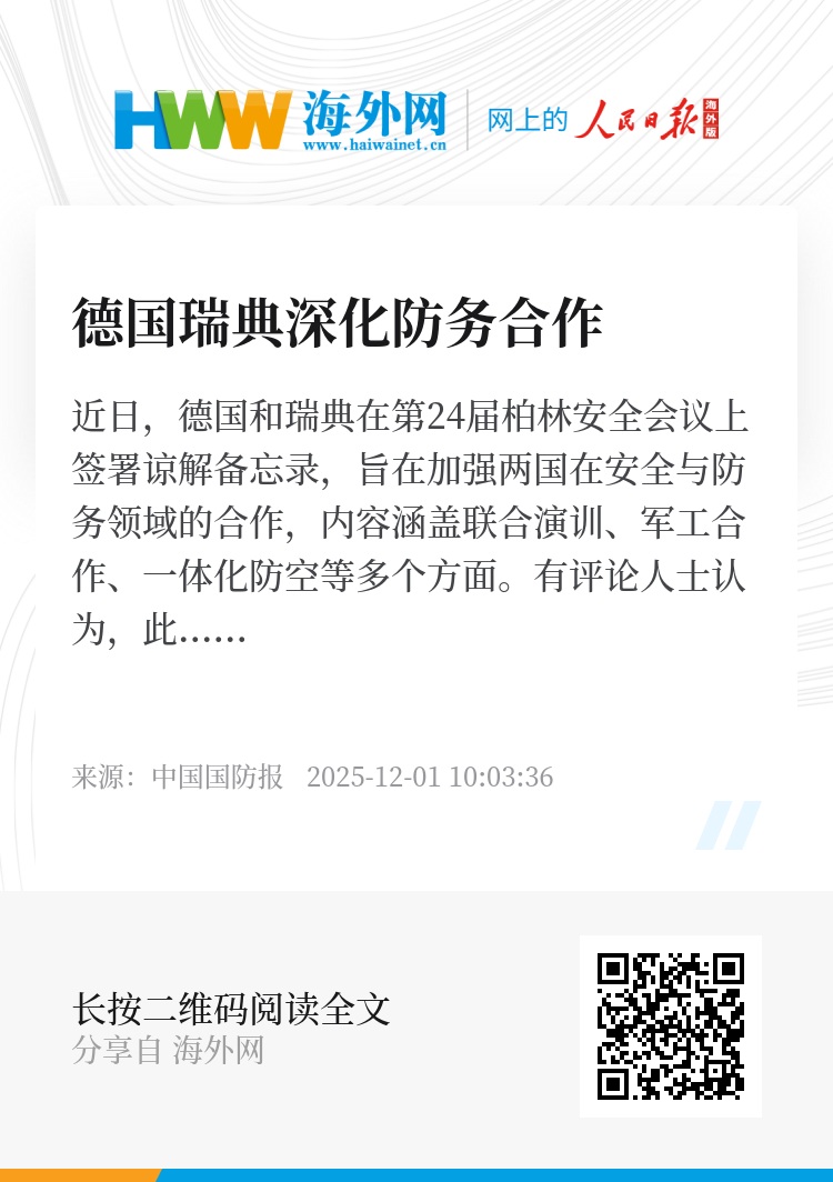 德国与瑞典强化防务合作,既是两国基于自身利益的理性选择,也是当前地缘格局调整背景下的战略举措。