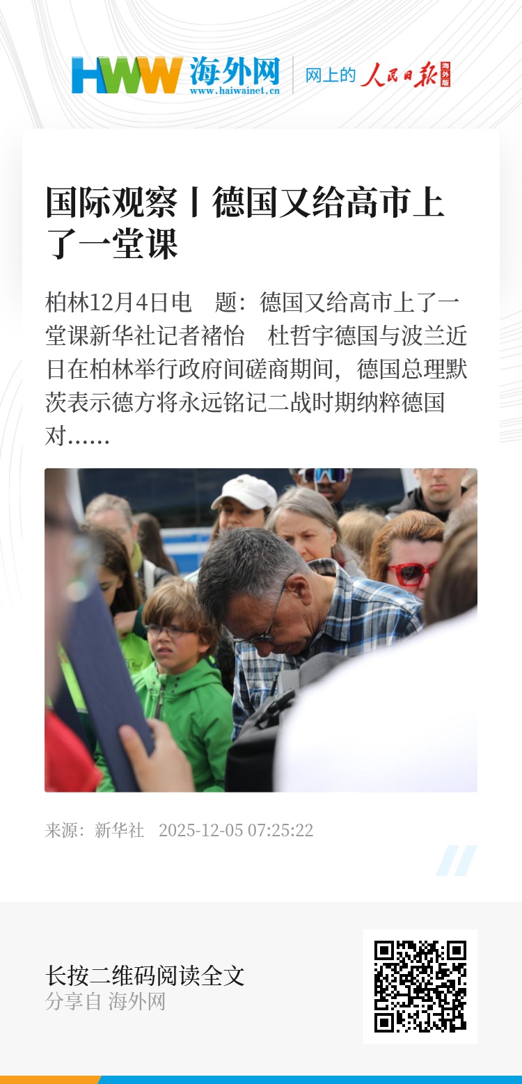 默茨1日在会见到访的波兰总理图斯克后,明确表示将“铭记历史”作为德波关系的重要议程,称二战时期纳粹德国对波兰的暴行是“一条核心历史教训”,“我们不能、也不愿把历史排除在视野之外,我们必须让记忆保持鲜活,哪怕是痛苦的记忆”。默茨说:“铭记历史、正视历史永无止境,德国会始终承担自己的历史责任。”