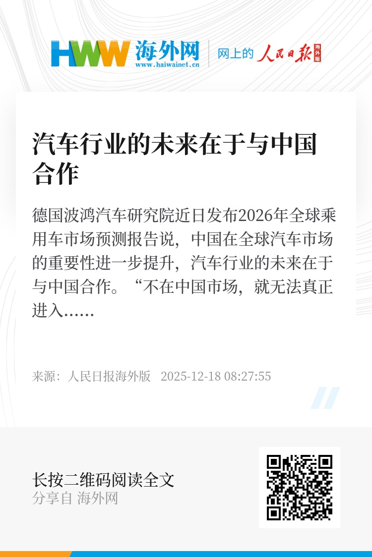 德国波鸿汽车研究院近日发布2026年全球乘用车市场预测报告说,中国在全球汽车市场的重要性进一步提升,汽车行业的未来在于与中国合作。