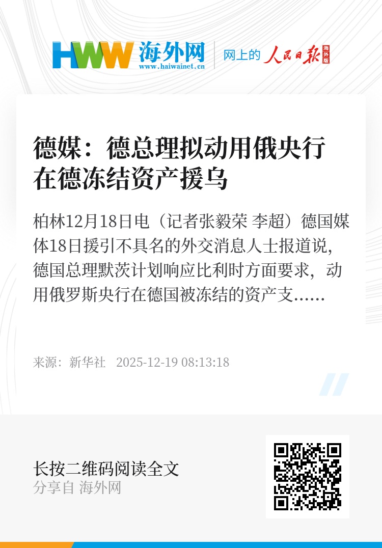 新华社柏林12月18日电(记者张毅荣 李超)德国媒体18日援引不具名的外交消息人士报道说,德国总理默茨计划响应比利时方面要求,动用俄罗斯央行在德国被冻结的资产支援乌克兰。