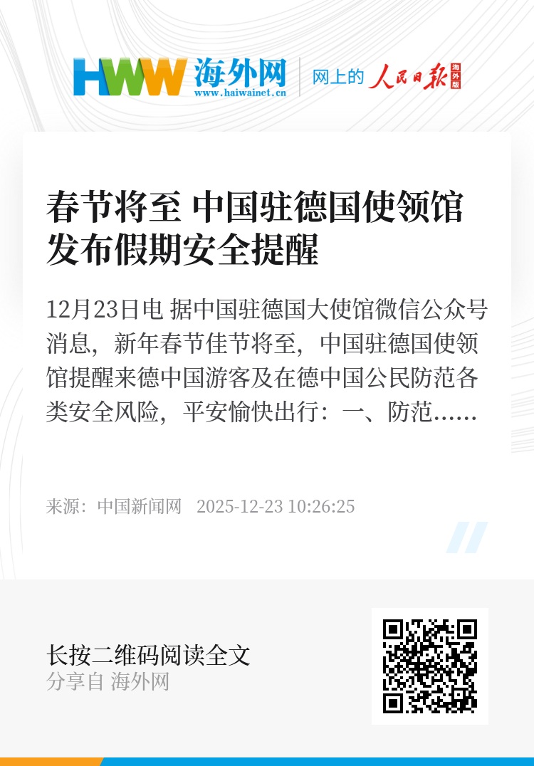 中新网12月23日电 据中国驻德国大使馆微信公众号消息,新年春节佳节将至,中国驻德国使领馆提醒来德中国游客及在德中国公民防范各类安全风险,平安愉快出行: