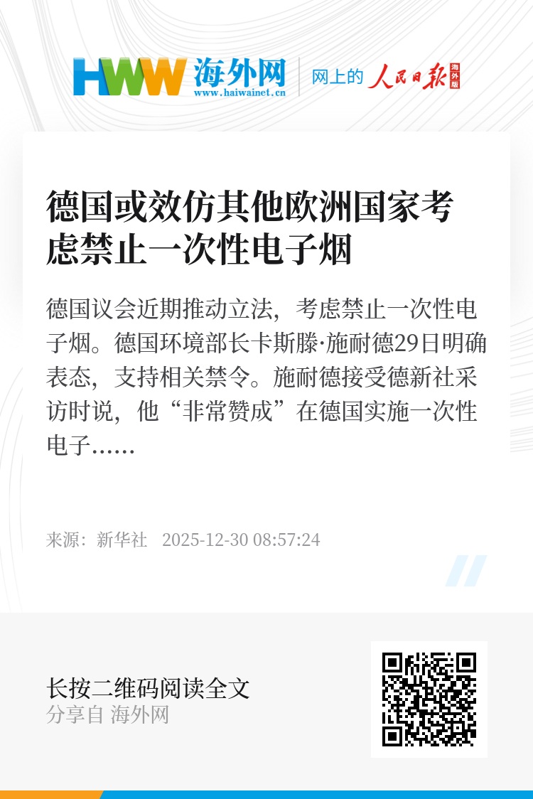 德国议会近期推动立法,考虑禁止一次性电子烟。德国环境部长卡斯滕·施耐德29日明确表态,支持相关禁令。
