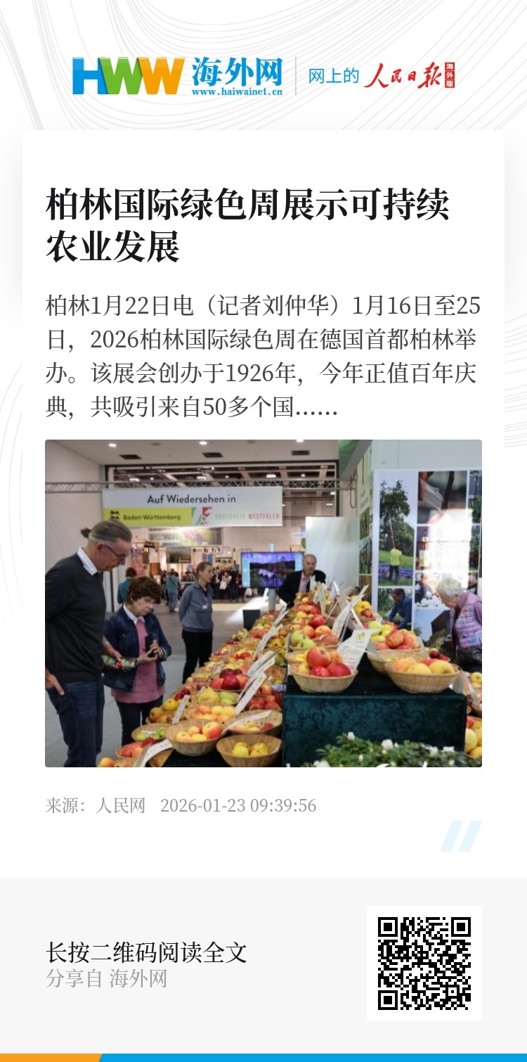 人民网柏林1月22日电(记者刘仲华)1月16日至25日,2026柏林国际绿色周在德国首都柏林举办。该展会创办于1926年,今年正值百年庆典,共吸引来自50多个国家的1600余家参展商,集中呈现食品、农业与园艺领域的最新成果。百年历史积淀与前沿科技在此交汇,使本届展会不仅成为农业发展的回顾之旅,更为未来可持续农业发展提供了指引。