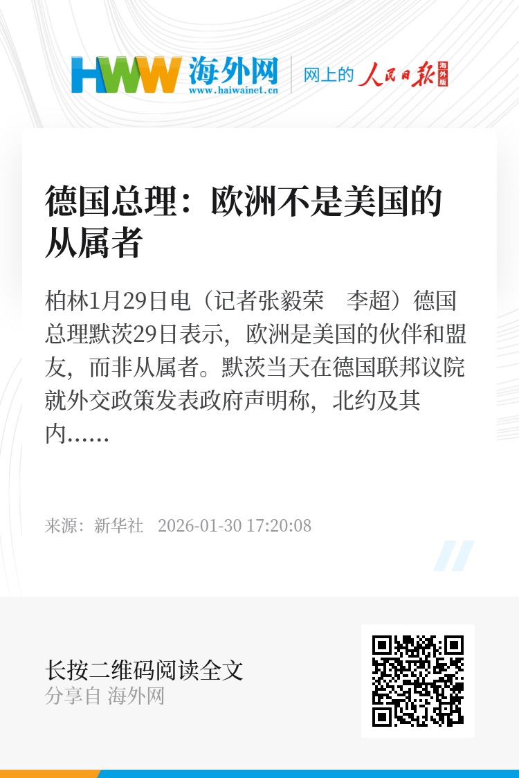 新华社柏林1月29日电(记者张毅荣 李超)德国总理默茨29日表示,欧洲是美国的伙伴和盟友,而非从属者。