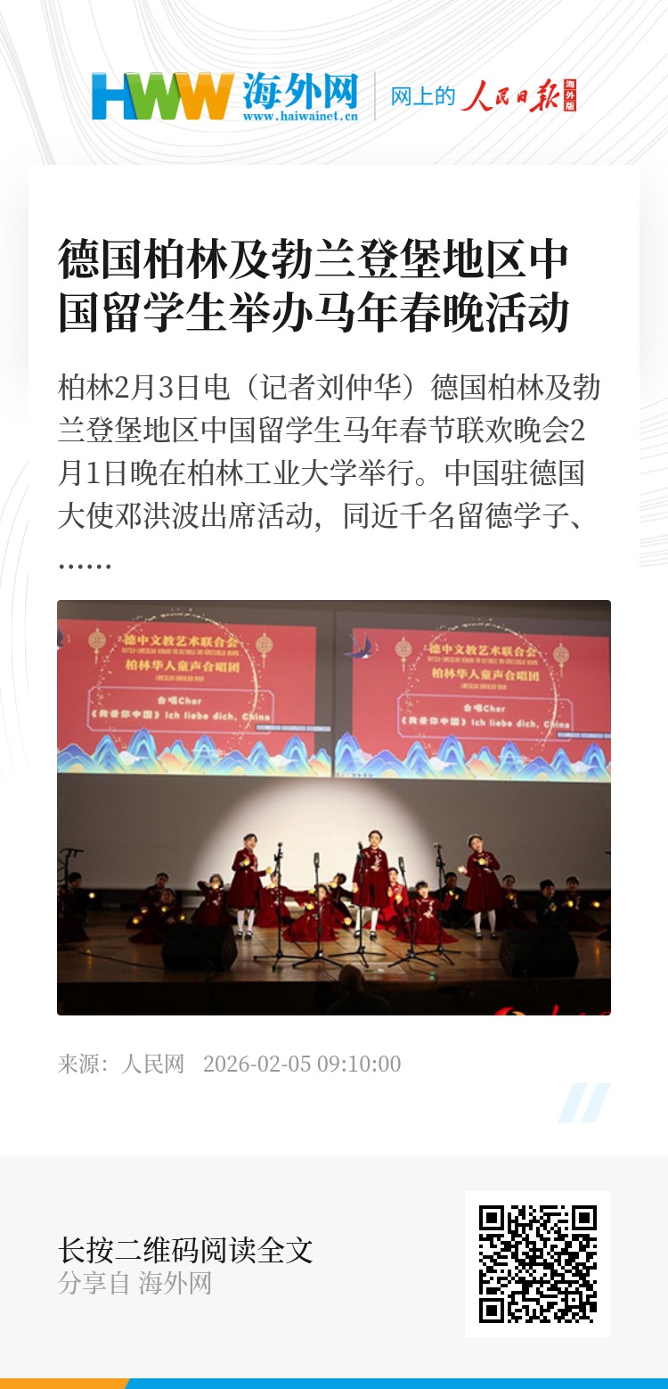 人民网柏林2月3日电(记者刘仲华)德国柏林及勃兰登堡地区中国留学生马年春节联欢晚会2月1日晚在柏林工业大学举行。中国驻德国大使邓洪波出席活动,同近千名留德学子、华侨华人和当地民众共庆新春佳节。