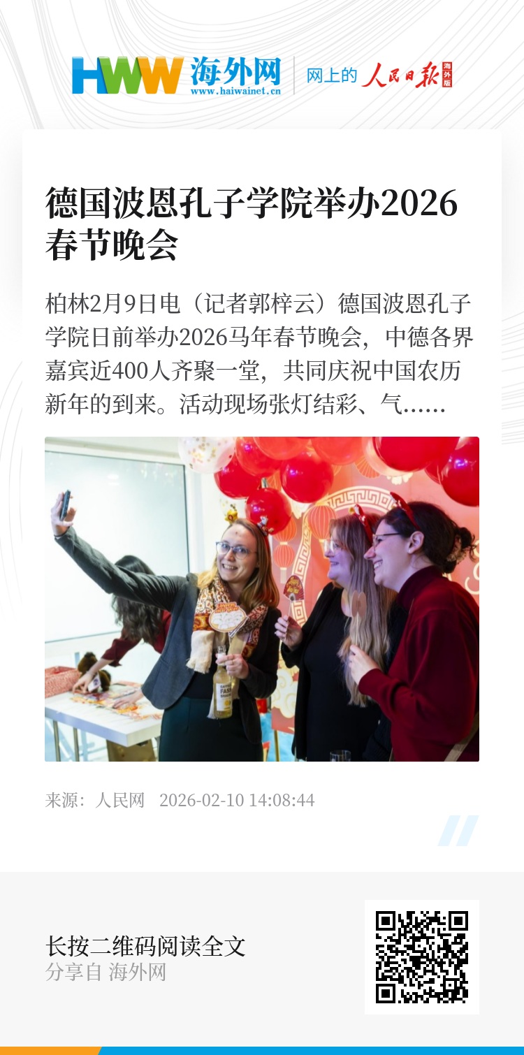 人民网柏林2月9日电(记者郭梓云)德国波恩孔子学院日前举办2026马年春节晚会,中德各界嘉宾近400人齐聚一堂,共同庆祝中国农历新年的到来。