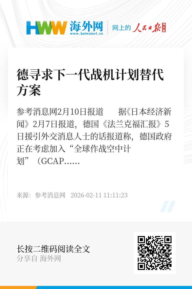参考消息网2月10日报道 据《日本经济新闻》2月7日报道,德国《法兰克福汇报》5日援引外交消息人士的话报道称,德国政府正在考虑加入“全球作战空中计划”(GCAP)。该计划是日本、英国和意大利共同发起的战斗机联合研发项目。