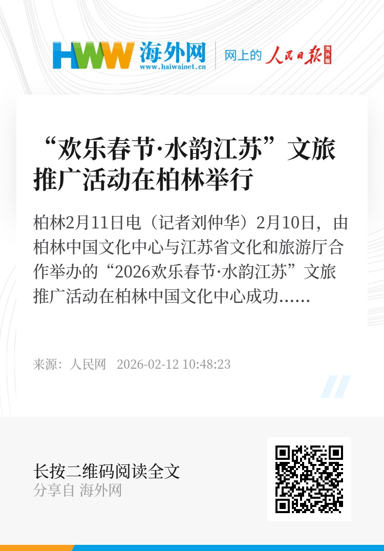 人民网柏林2月11日电(记者刘仲华)2月10日,由柏林中国文化中心与江苏省文化和旅游厅合作举办的“2026欢乐春节·水韵江苏”文旅推广活动在柏林中国文化中心成功举行。活动以“欢乐春节”为契机,以“水韵江苏”为主题,通过文旅推介、非遗展示与艺术表演相结合的形式,向德国社会各界集中展示江苏深厚的历史文化底蕴,以及当代中国开放、自信、充满活力的发展形象。