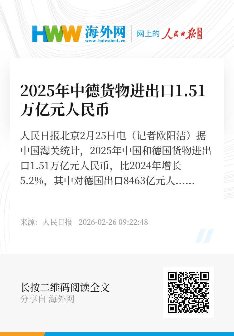 人民日报北京2月25日电(记者欧阳洁)据中国海关统计,2025年中国和德国货物进出口1.51万亿元人民币,比2024年增长5.2%,其中对德国出口8463亿元人民币、自德国进口6643亿元人民币。德国继续保持中国在欧洲最大的贸易伙伴国,中国时隔一年重返德国最大贸易伙伴国。