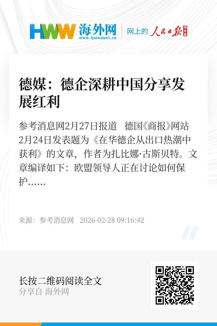 参考消息网2月27日报道 德国《商报》网站2月24日发表题为《在华德企从出口热潮中获利》的文章,作者为扎比娜·古斯贝特。文章编译如下: