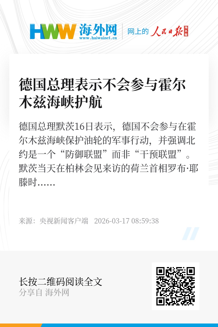 德国总理默茨16日表示,德国不会参与在霍尔木兹海峡保护油轮的军事行动,并强调北约是一个“防御联盟”而非“干预联盟”。