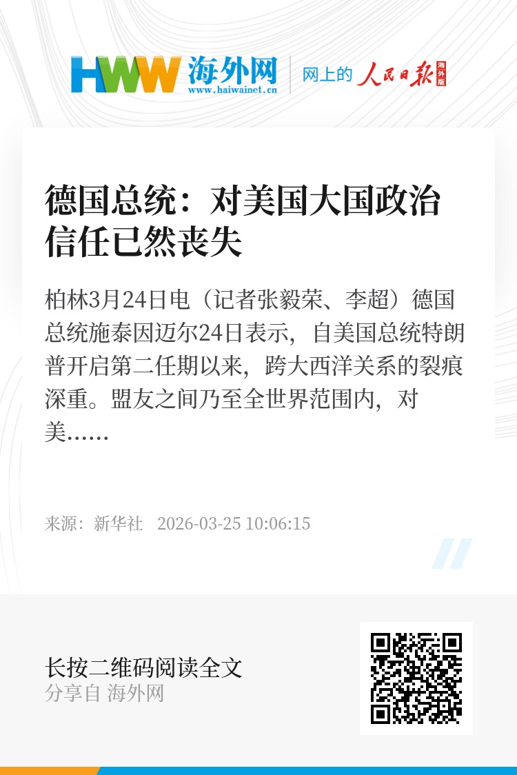新华社柏林3月24日电(记者张毅荣、李超)德国总统施泰因迈尔24日表示,自美国总统特朗普开启第二任期以来,跨大西洋关系的裂痕深重。盟友之间乃至全世界范围内,对美国大国政治的信任已然丧失。