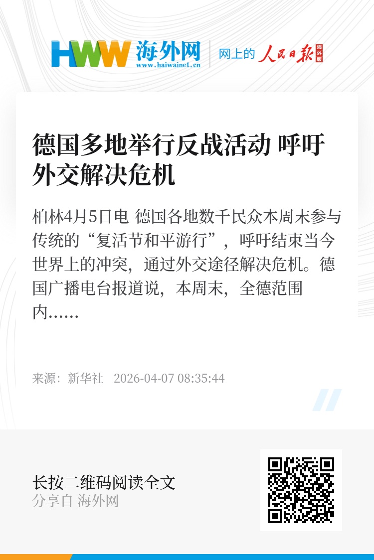 新华社柏林4月5日电 德国各地数千民众本周末参与传统的“复活节和平游行”,呼吁结束当今世界上的冲突,通过外交途径解决危机。