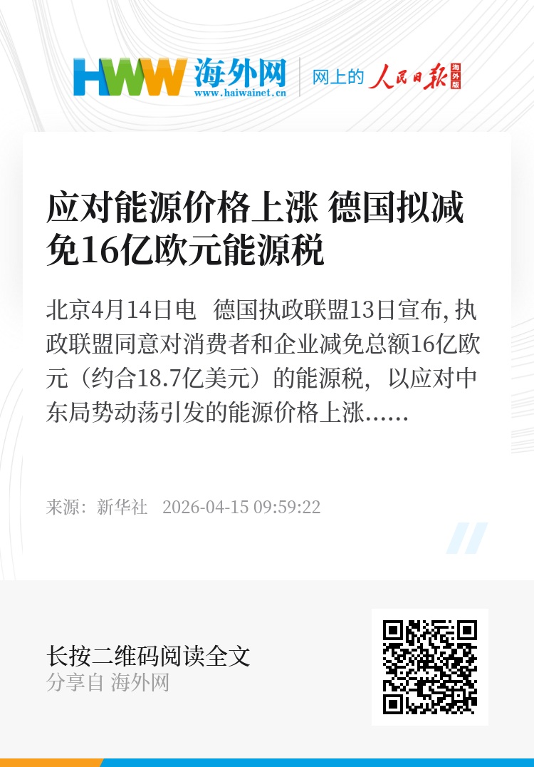 新华社北京4月14日电 德国执政联盟13日宣布,执政联盟同意对消费者和企业减免总额16亿欧元(约合18.7亿美元)的能源税,以应对中东局势动荡引发的能源价格上涨。