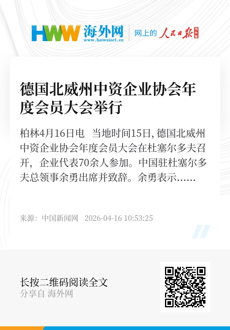 中新网柏林4月16日电 当地时间15日,德国北威州中资企业协会年度会员大会在杜塞尔多夫召开,企业代表70余人参加。中国驻杜塞尔多夫总领事余勇出席并致辞。