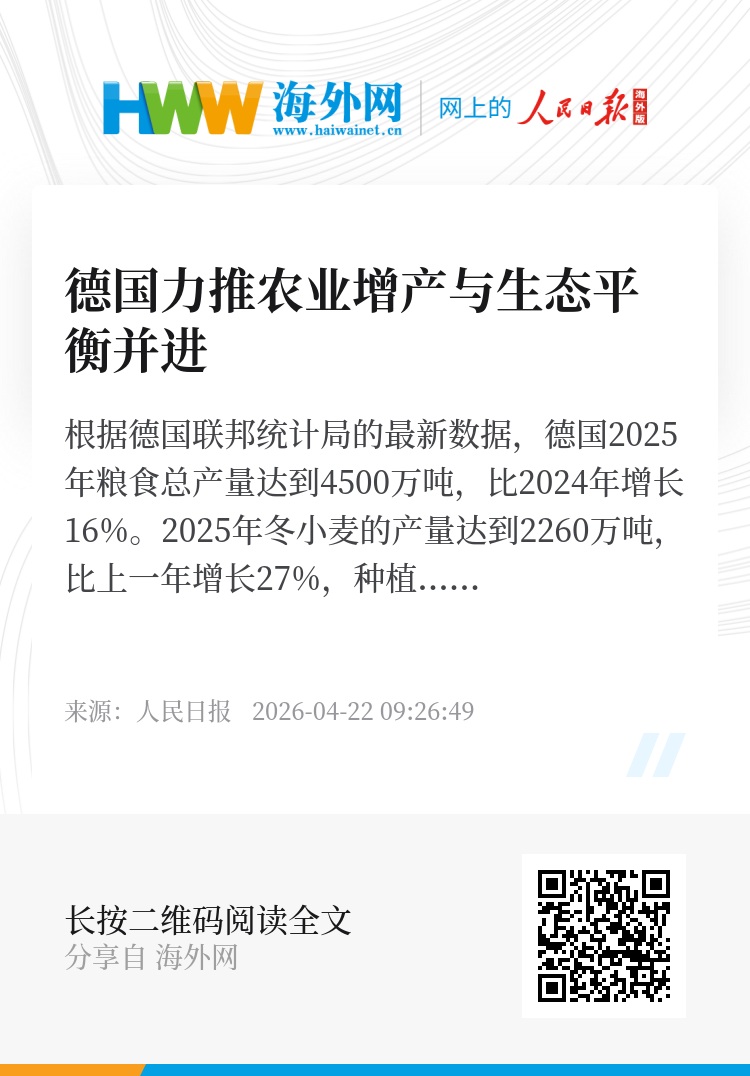 根据德国联邦统计局的最新数据,德国2025年粮食总产量达到4500万吨,比2024年增长16%。2025年冬小麦的产量达到2260万吨,比上一年增长27%,种植面积达到290万公顷;2025年冬季油菜籽产量达到400万吨,比2024年增长10%。德国联邦农业、食品和区域认同部将投入约1000万欧元,用于支持农业数字化转型与科技创新。