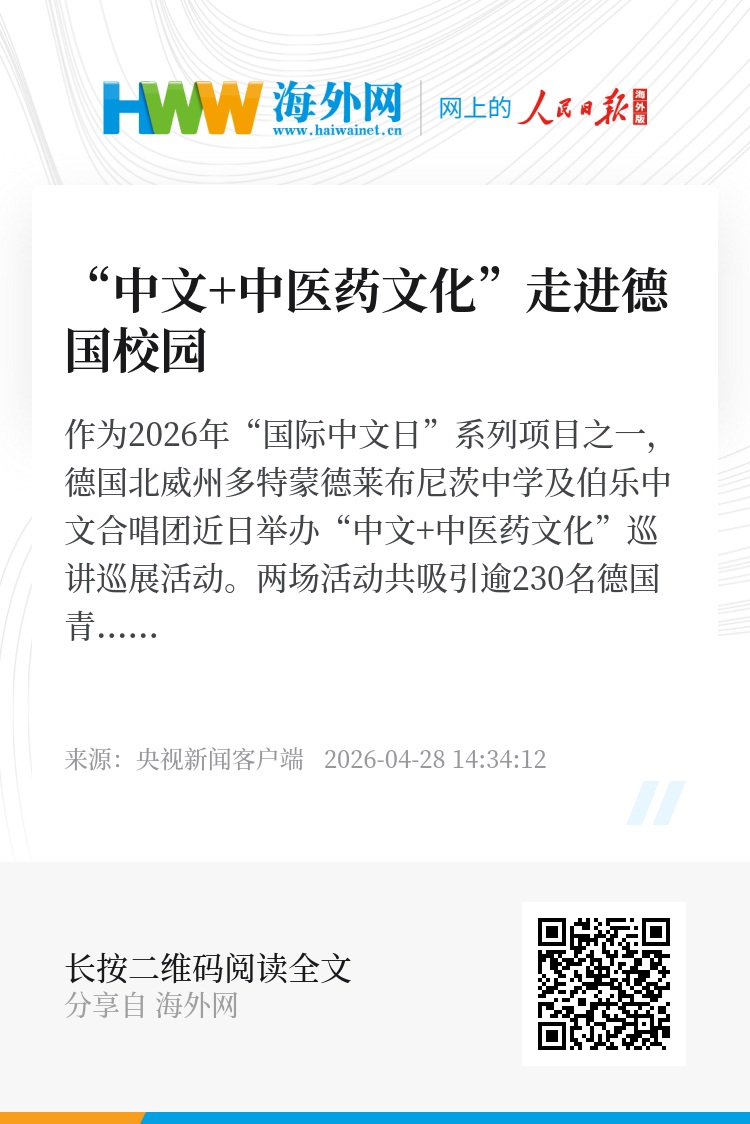 作为2026年“国际中文日”系列项目之一,德国北威州多特蒙德莱布尼茨中学及伯乐中文合唱团近日举办“中文+中医药文化”巡讲巡展活动。两场活动共吸引逾230名德国青少年及家长参与,在互动体验中感受中医药文化魅力,激发学习中文的兴趣。